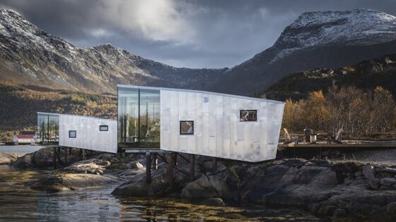 В мире не так уж много поселений за Полярным кругом Северного полушария, а популярные курорты в этих суровых края можно пересчитать по пальцам. Один из них, расположенный на норвежском острове Мансхаузен, после обновления в этом году собрал внушительный урожай премий и наград. Среди них Architizer A + 2019, Dezeen Award 2019 и International Design Awards. Все началось в 2015-ом, когда архитектор Снорри Стайнссон построил первые четыре гостевых домиках на берегу. Сегодня их вдвое больше, здесь есть сауна и зона отдыха, но фактически 22 гектара частного курорта как были частью дикой природы, так ей и остались. Домики весьма выделяются своим футуристическим видом, но не портят пейзаж, а подчеркивают его самобытность. Строения выполнены из клееного бруса с облицовкой из алюминия для защиты от соленой воды и зимних осадков. В каждом домике половина строения нависает над водой, опираясь на сваи, и имеет панорамное остекление. Здесь очень удобно отдыхать от забот цивилизации и ощущать единение с природой. Чтобы не разрушить эту атмосферу, все планы по расширению курорта решили заморозить на неопределенный срок.