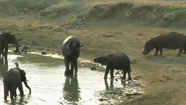 Туристы стали свидетелями конфликта между слонами и бегемотом в национальном парке Хванге в Зимбабве. Кадры, снятые очевидцем, опубликованы на сайте Newsflare. Бегемот направлялся к водоему, который окружали слоны. Его действия не понравились одному из самцов. «Сперва слон повернулся, направил хобот в строну бегемота и окатил его брызгами, одновременно громко трубя, — рассказывает автор видео. — Не дождавшись реакции, он вышел из себя, испустил громкий низкий крик и шлепнул бегемота хоботом по заду, чтобы отогнать от воды». Только после этого тот ускорился. В Национальном парке Хванге встречаются около ста видов млекопитающих. Помимо слонов и бегемотов, там обитают львы, гиены двух видов, гиеновидные собаки, гепарды и африканские леопарды. В апреле сообщалось, что в южноафриканском национальном парке Крюгера слоны бросились на помощь тонущему детенышу, который упал в кишащую крокодилами реку. Им удалось вывести его на мелководье.