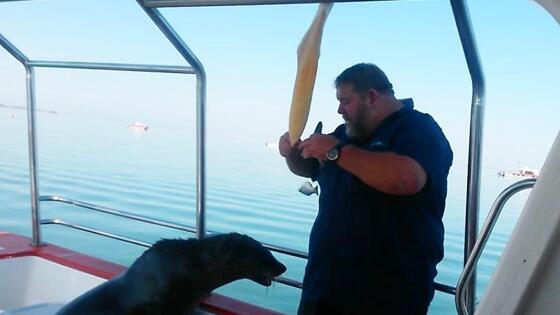 Работник туристической организации решил подкормить морских львов прямо на судне, во время круиза возле побережья портового города Уолфиш-Бей в Намибии. Морское млекопитающее не заставило себя долго ждать и бесцеремонно забралось на палубу, где его ждало лакомство. Скормив тюленю несколько рыбин, гид был атакован, забравшимся на крышу пеликаном, который стащил рыбёшку из рук кормильца, а затем переместился на безопасное расстояние. Впрочем, морской лев продолжил свою трапезу, не обращая внимания на пернатого конкурента, попытавшегося ещё несколько раз лишить его обеда. Видеосюжет, снятый туристкой летом 2016 года, на днях привлёк внимание британских журналистов.