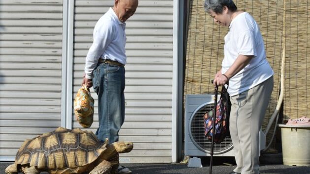 Хисао Митани, гуляя с супругой в праздничный день, решили завести черепашку. В зоомагазине им продали крохотное земноводное, длиной не более 5 см, которую супруги назвали в честь праздника: Бон-Чан. Спустя 20 лет Хисао и Бон-Чан стали местной достопримечательностью в Токио. Все дело в том, что черепаха за это время заметно выросла, а вес ее перевалил за 70 кг. Японец каждый день выгуливает своего питомца по улицам города, и с ними хотят сфотографироваться толпы туристов. Бон-Чан питается исключительно фруктами и овощами. Он не обращает на свалившуюся на него популярность никакого внимания. [caption id="attachment_1002659" align="aligncenter" width="1000"] AFP PHOTO / KAZUHIRO NOGI[/caption]