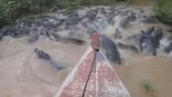 Бразильские любители острых ощущений, совершая путешествие по дикой местности, потревожили покой десятков крокодилов, расположившихся в небольшом водоёме. Один из рыбаков запечатлел, как рептилии, готовые в любой момент наброситься на чужаков, остались позади лодки. Экстремальный тур по опасному месту мог стать последним для отважных путешественников, если бы в тот момент моторное плавсредство подвело любителей водных прогулок.
