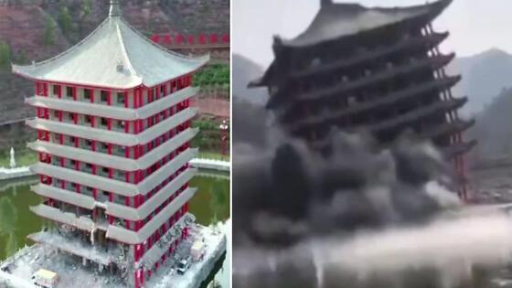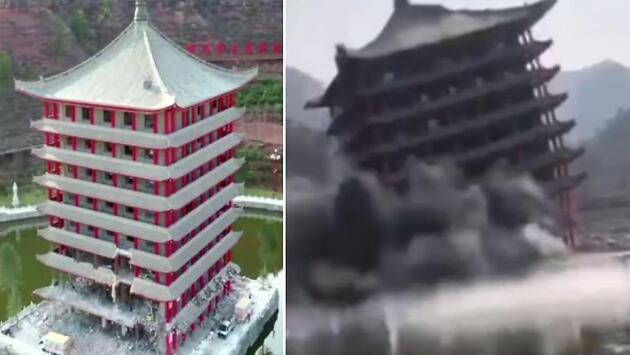 Многоэтажное здание отеля, построенное по образцу древней китайской архитектуры, на площадке посередине водоёма, на днях было демонтировано в уезде Ханьчэн (округ Вэйнань, провинция Шэньси, КНР). Местные чиновники, выявив нарушение закона при возведении массивного сооружения в историческом месте, решили снести построенный за короткий срок отель. Взрывотехники со всех ракурсов запечатлели момент ликвидации массивной постройки.