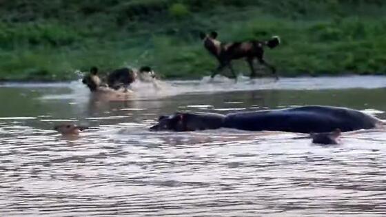 Последние моменты из жизни молодой импалы, забравшейся в водоём и оказавшейся в окружении бегемотов и диких собак, были запечатлены туристом, путешествующим по африканскому заповеднику. Гиппопотам, обнаружив парнокопытного зверя, сбежавшего от собачьей своры, оградил его от хищников. Но в конечном итоге массивный обитатель водоёма утопил импалу и лишил диких псов добычи.