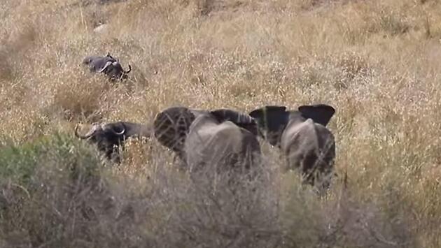 Противостояние между двумя кланами животных было запечатлёно туристом, проводившим свой досуг в одном из заповедников в Южной Африке. Стадо слонов, обнаружив на своём пути буйволов, окружило парнокопытных наглецов и вынудило их уйти со своего пути. Но один из буйволов не испугался грозных оппонентов и проигнорировал угрозы. Примечательно, что вожак слоновьего стада дважды показывал наглецу направление бегства, но не добившись взаимопонимания от парнокопытного зверя, слон не стал входить с ним в открытое противостояние и оставил буйвола и его сородичей в покое.