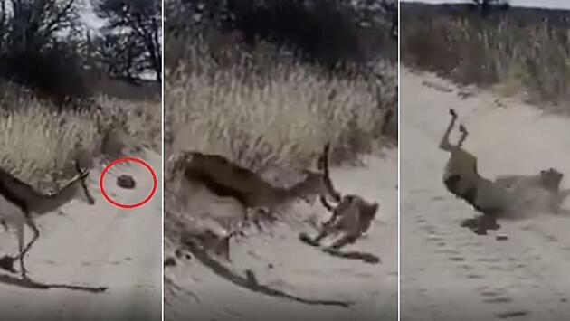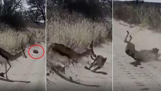 Туристы, устроившие слежку за хищной кошкой, затаившейся на пыльной дороге, не стали мешать ей охотиться и спасать парнокопытного обитателя заповедника. Один из путешественников запечатлел, как антилопы одна за другой, осматриваясь по сторонам, переходят опасный участок пути. Когда три парнокопытных диких зверя пересекли дорогу, лежащий недалеко неприметный комок вдруг ожил и оказался леопардом, который совершил атаку на четвёртую антилопу и не оставил ей никаких шансов на спасение.