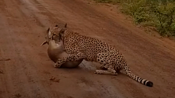 В Национальном парке Крюгера в ЮАР экскурсовод запечатлел на камеру смертельную битву дукера (хохлатой антилопы) с гепардом, считающимся самым быстрым животным в мире. Запись опубликована на канале Kruger Sightings на YouTube. 27-летний гид Зандри Уайт (Zandri White) возвращался по главной дороге заповедника домой, когда увидел уникальную сцену из мира дикой природы. «Я заметил самку гепарда и ее детеныша, — вспоминает он. — Она исчезла в высокой траве на противоположной стороне дороги и через несколько секунд вернулась с дукером в зубах!» По словам Уайта, в какой-то момент дукер едва не вырвался из пасти гепарда, однако хищник этого не допустил. «Гепарду потребовалось не меньше шести минут, чтобы одолеть маленькую антилопу, — дольше, чем обычно; они устроили неплохую драку! — рассказывает гид. — В конце ролика видно, как он тащит антилопу туда, где оставил своего детеныша». Национальный парк Крюгера находится на северо-востоке ЮАР. На его территории обитает около полутора тысяч львов, 12 тысяч слонов, 2,5 тысячи буйволов, около тысячи леопардов и пять тысяч носорогов. Ранее сообщалось, что туристы в южноафриканском парке Саби-Сэнд стали свидетелями охоты леопарда на хохлатую антилопу. Автор видео услышал отчаянные крики животного, когда остановился возле реки, чтобы посмотреть на слонов.