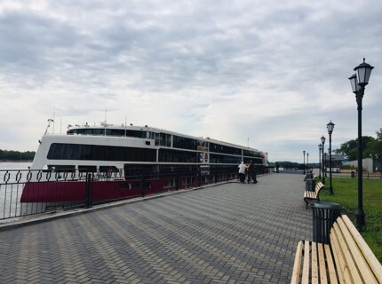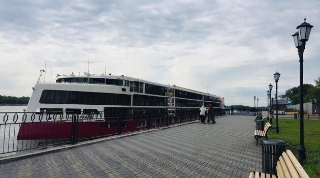 Самый большой курсирующий по рекам российский круизный лайнер «Мустай Карим» остановился у берега Сарапула